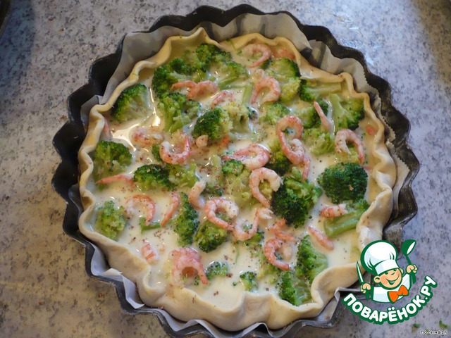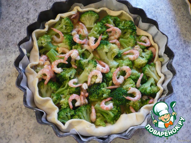 На присыпанной мукой рабочей поверхности раскатать тесто. Вырезать из него круг диаметром чуть больше диаметра формы для выпекания. Разъемную форму смазать маслом, застелить пергаментом. Тесто аккуратно уложить в форму так, чтобы оно закрывало дно и на 2-3 см заходило на бортики. Края теста подогнуть внутрь. Выложить на тесто брокколи и креветки.