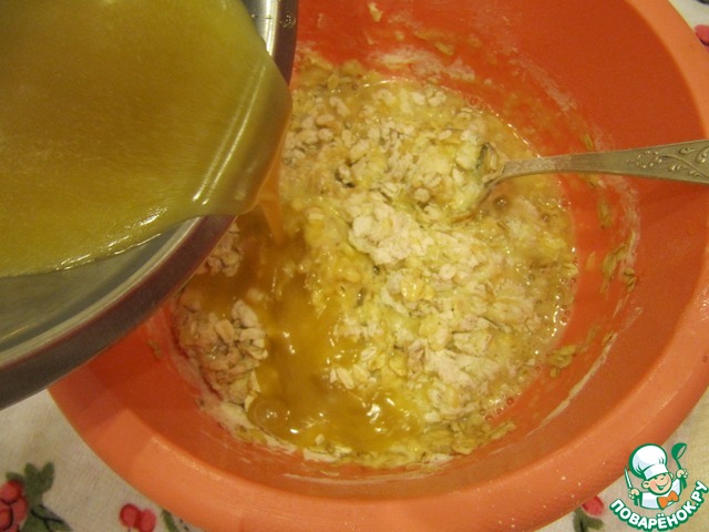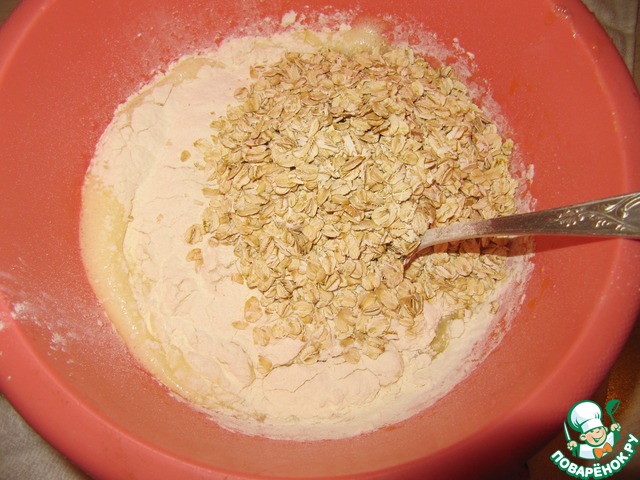 Помешивая всыпать просеянную с разрыхлителем муку и овсяные хлопья