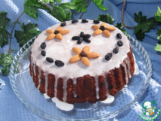 Полить приготовленной глазурью пирог, украсить миндалем и изюмом
