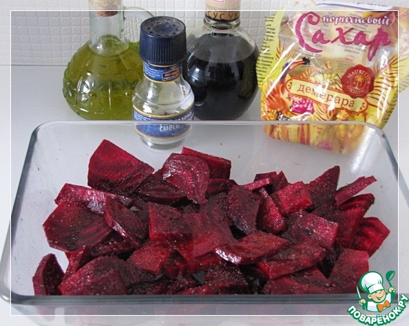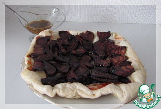 В жаропрочной форме растопите сливочное масло, добавьте оливковое масло, бальзамик, сахар, соль, перец. Выложите ломтики тонко порезанной свеклы, перемешайте. Это удобно делать в той же форме, в которой будет выпекаться тарт.