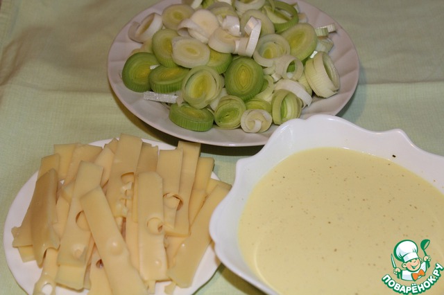 Подготавливаю продукты: лук-порей нарезаю кольцами около 0,5 см, сыр - тонкими полосками, яйца взбиваю с смесью приправ карри и солью. Взбивала старой механической взбивалкой, случайно наткнулась и захотелось "вспомнить все", работает отлично.