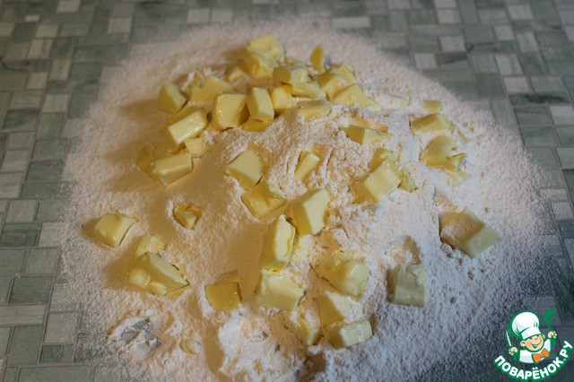 Муку просеиваю с солью на стол, добавляю нарезанное небольшими кусками сливочное масло, перетираю руками в крошку.