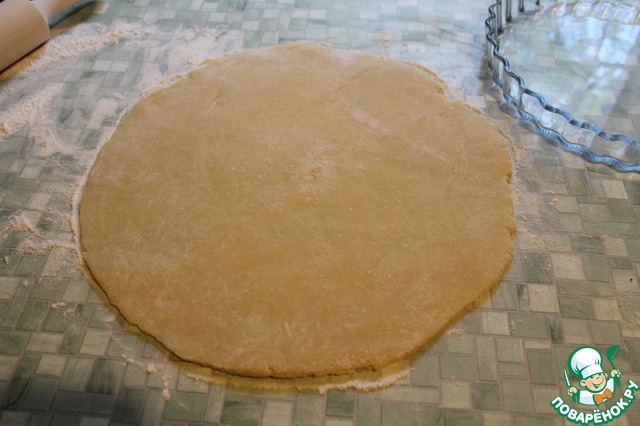 Кладу круг из теста в форму, застеленную пекарской бумагой, формирую бортики, лишнее тесто срезаю.