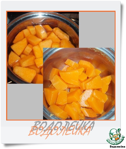 Очищенную тыкву режем на кусочки, заливаем водой и варим до готовности.