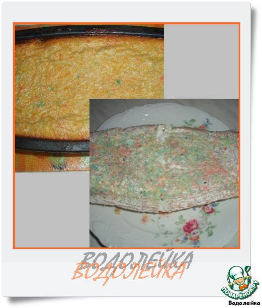 Готовый пирог немного остудить, вынуть из формы, верх смазать тонким слоем сметаны и посыпать оставшейся кокосовой стружкой. Вот тут цветная стружка пришлась как раз кстати.
