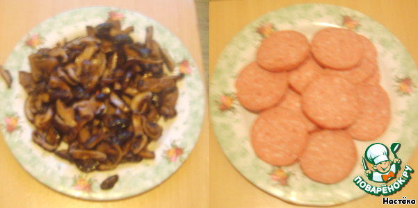 Открытый пирог с грибами и с колбасой
