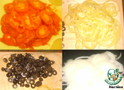Лук, Перец болгарский, Помидоры и Оливки нарезаем тонкими кольцами
