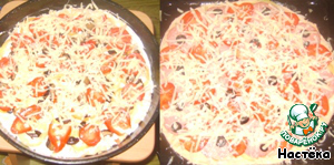 Для пиццы с грибами: смазываем тесто майонезом, кольцами выкладываем лук, кольцами перец, грибы, помидоры, оливки, и посыпаем 100 гр сыра.