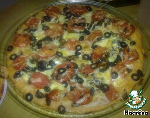 Для пирога с колбасой: тесто посыпаем 100 гр сыра, поверх сыра кладем колбасу, выкладываем кольцами лук, перец, помидоры, оливки и посыпаем сыром.