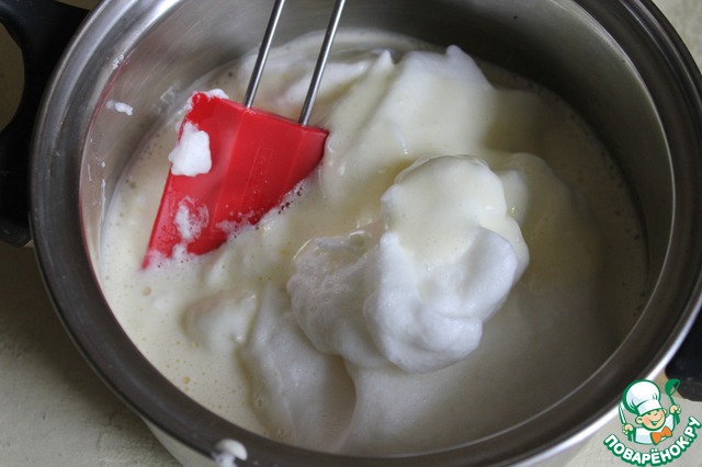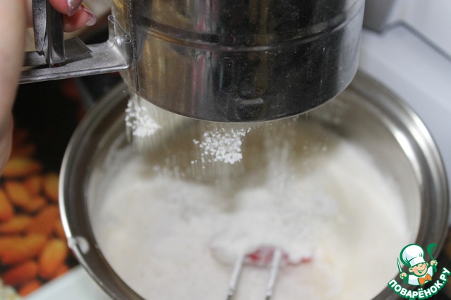 4 белка взбиваем сначала на небольшой скорости, постепенно увеличивая скорость, через пару минут добавляем 25г сахара, продолжаем взбивать до устойчивой пены