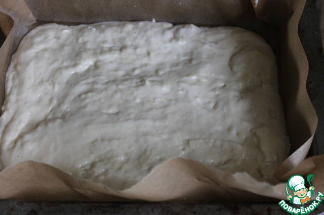 Готовое тесто выкладываю на противень, застеленный промасленным пергаментом