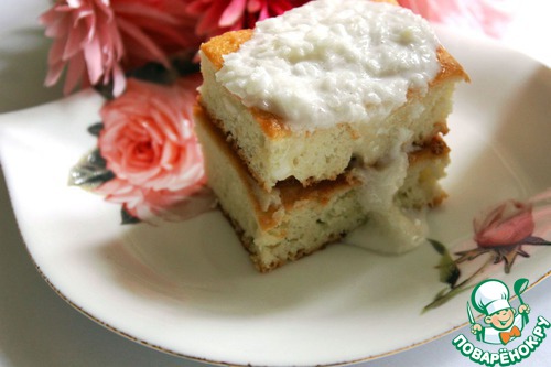И залить кокосовой заливкой. Разрезать пополам, положить одну половинку на другую и дать постоять и пропитаться несколько часов. Хочу вам сказать, что наутро, постояв ночь, пирог был просто восхитительным. Но осталось его немного)))