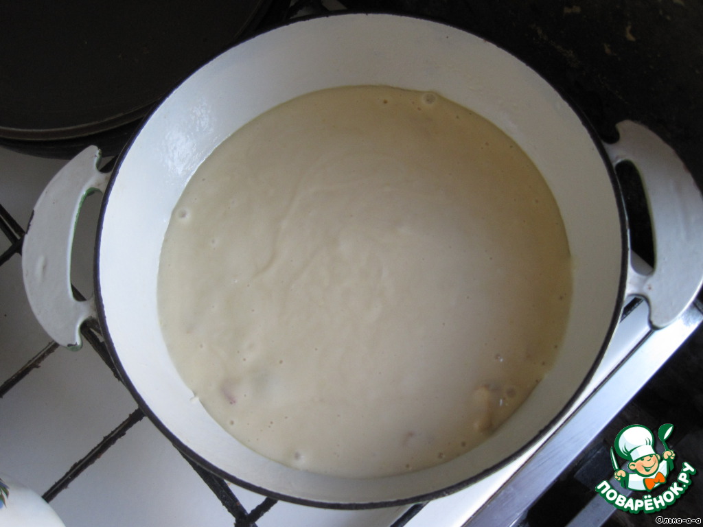 Затем залить тестом и жарить на медленном огне, накрыв крышкой около 40 минут (можно выпекать в духовке, но я так еще не делала).