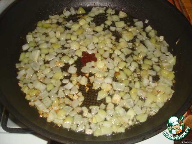 5. К луку добавить измельченное сердце, томат пасту, специи. Готовить до мягкости мяса.