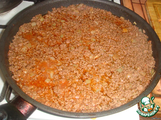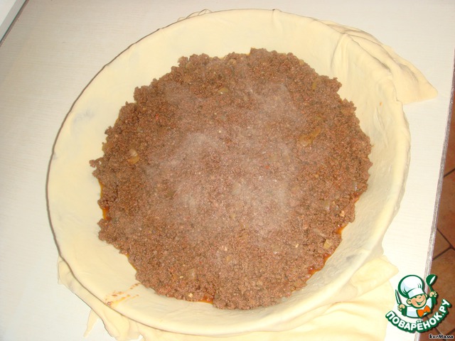 7. В форму, предварительно смазанную маслом, уложить тесто так, чтобы концы свешивались, но серединка оставалась достаточно плотной! Выложить готовый фарш. Сверху выложить ломтики картошки.