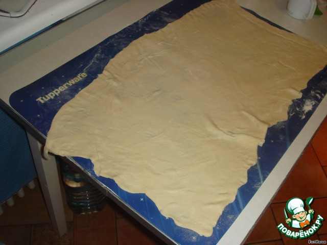 6. Тесто раскатать тонко на рабочей поверхности, присыпанной мукой.