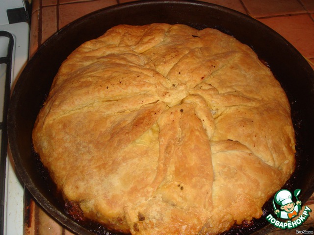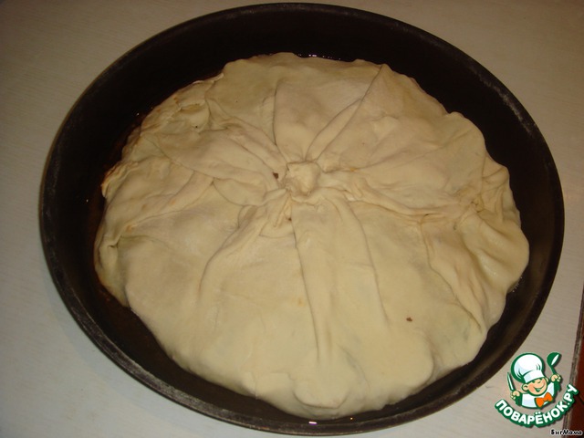 9. Отправляем пирог в разогретую до 250 градусов духовку. У меня на выпекание ушло примерно час. Минут за 15 до готовности, я проткнула самый толстый край теста спичкой на предмет готовности и полила выделившимся соком самую верхушку пирога, чтобы не горела и пропиталась.
