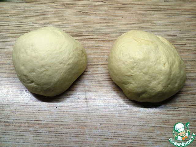 Когда тесто поднялось, выкладываем его на стол, немного обминаем и делим на 2 части. Даем ему отдохнуть 15 минут.