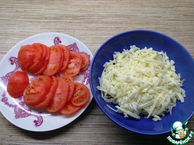Пока займемся начинкой. С помидор снимаем кожицу, каким вам удобно способом, я просто срезала специальным ножом. Нарезаем колечками. Сыр натираем на терке.
