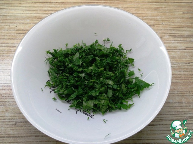 Зелень промыть, обсушить и мелко нарезать. Зелень можете использовать абсолютно любую, на свой вкус.