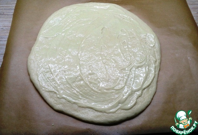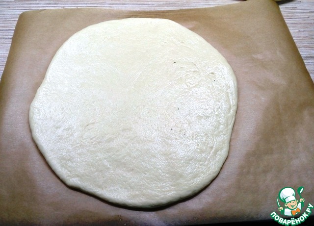 Раскатываем один кусок теста диаметром 24 см. Я для удобства делала это сразу на пергаменте.