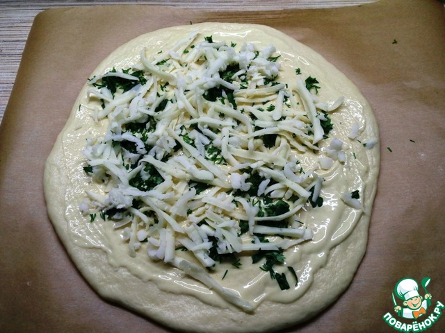 И посыпаем второй четвертью сыра. Запекаем в духовке при температуре 200С 15-20 минут, пока тесто не станет золотистым, а сыр загорелым. Точно так же поступаем со второй частью теста.
