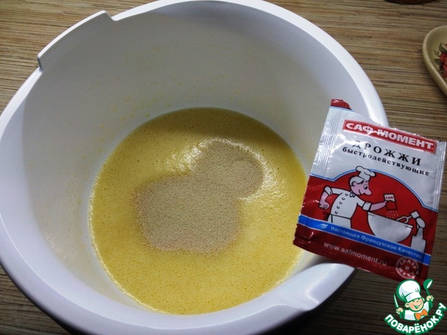 А еще пирог можно приготовить в хлебопечке. Выложите ингредиенты в контейнер, соблюдая следующий порядок: молоко, яйца, размягченное сливочное масло, соль, сахар, мука и дрожжи. Если порядок закладки ингредиентов в вашей ХП отличается от этого, закладывайте согласно инструкции к вашей хлебопечке. Программа "Сладкий хлеб", вес пирога: 1 кг, корочка: средняя.