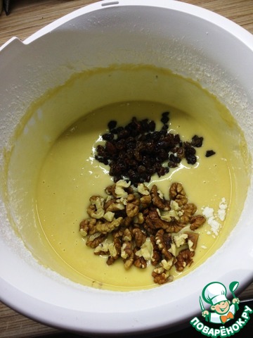 Всыпать половину муки, хорошо размешать, чтобы не было комочков. Добавить вымоченный изюм (вино предварительно слить) и орехи, можно использовать любые.