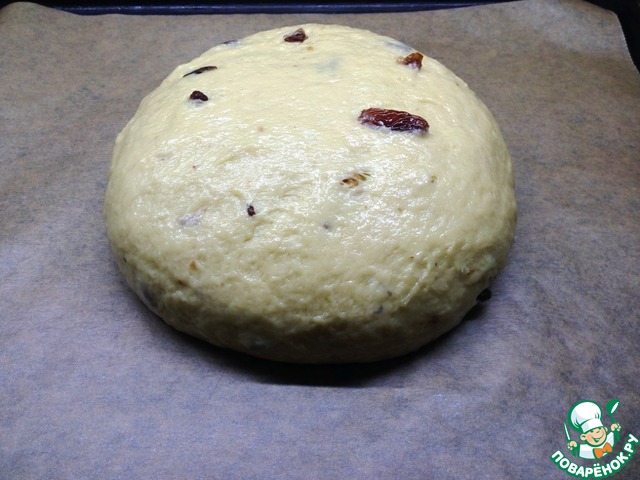 Добавить частями оставшуюся муку, замесить мягкое тесто. Сформировать пирог, выложить на противень или в форму для запекания, накрыть полотенцем и дать пирогу подойти.