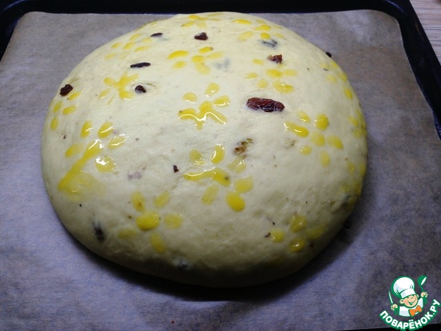 Пирог подошел, смазываем его яйцом или желтком рисуем узоры. Мы с дочкой нарисовали цветочки :) Выпекаем при т 200 С 25-30 минут. Проверьте деревянной палочкой.