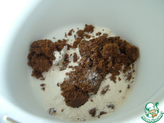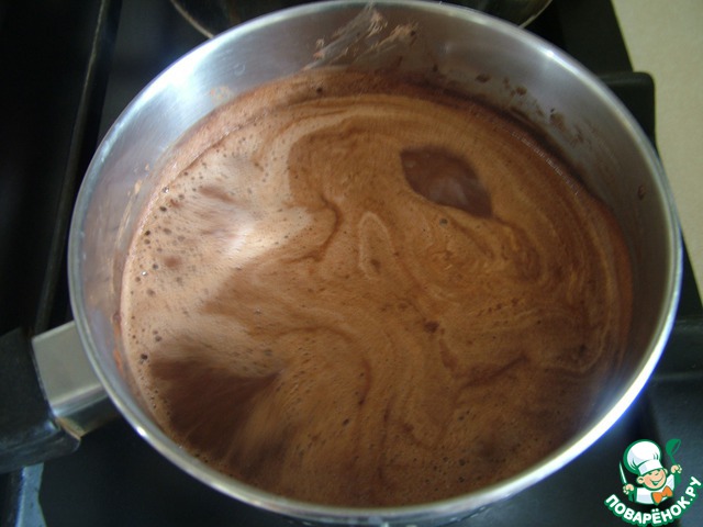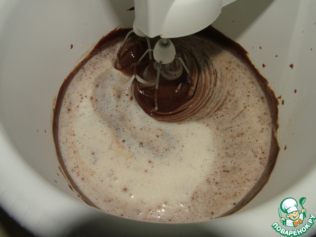 Горячей шоколадной смесью залить муку с сахаром и смешать на средней скорости. Добавить яично-кефирную смесь и на низкой скорости перемешивать минуту-две, до однородности, помогая миксеру ложкой.