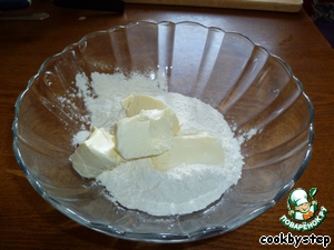 В муку добавить 60г сливочного масла, тщательно растереть ложкой до образования крошек.