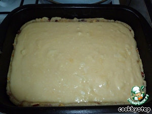 Начинку для пирога вылить на противень с тестом, стараясь, чтобы начинка не выходила за границы бортиков теста.