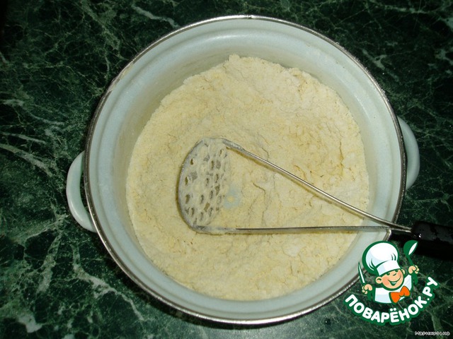 В муку добавляем сахар, соль и соду, затем кладем размягченное масло и растираем до состояния жирной крошки.