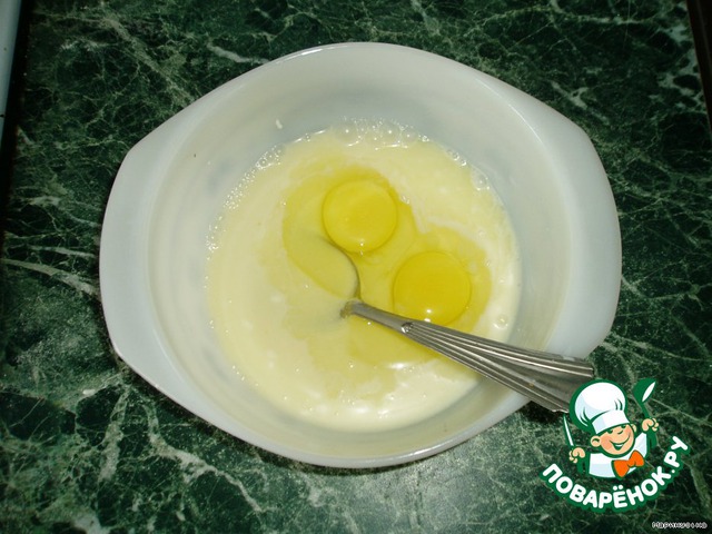 Жидкий мед разбалтываем с яйцами и сметаной (если мед засахарился, можно растопить его на водяной бане или в микроволновке).