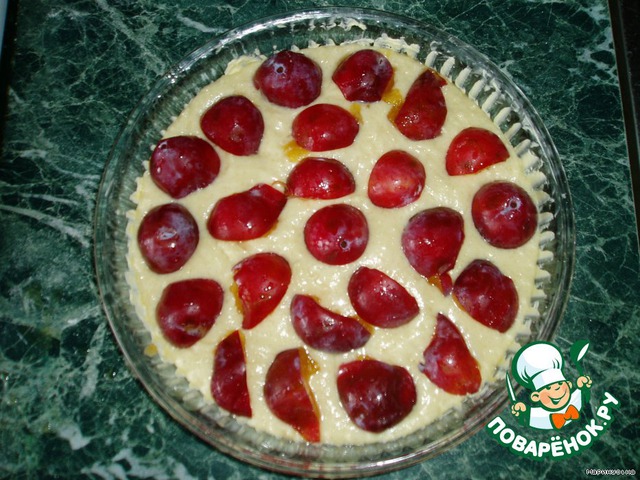 Все перемешиваем, тесто выливаем в смазанную форму, сверху раскладываем половинки слив, разрезом вверх, либо вниз (кому как нравится).