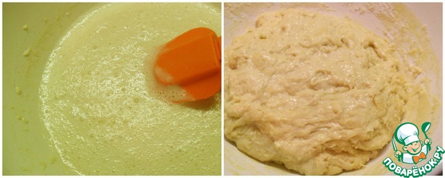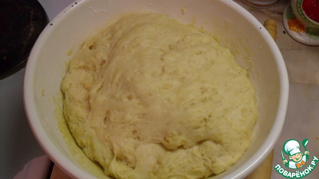 Итак: В теплом молоке развести пакетик сухих дрожжей, добавить 1 ч. л. сахара и 2 ст. л. муки. Хорошо перемешать, чтобы дрожжи растворились. Накрыть сухим полотенцем и поставить в теплое место на 15 мин. Тем временем венчиком взбить 2 яйца. По истечении 15 минут аккуратно, порциями смешать остальную муку с опарой (она к этому времени чуточку начала пузыриться), добавить оставшийся сахар, теплое (растопленное) сливочное масло и яйца. Добавить соль и замесить тесто, поставить в теплое место, пока будем готовить начинку и соус.