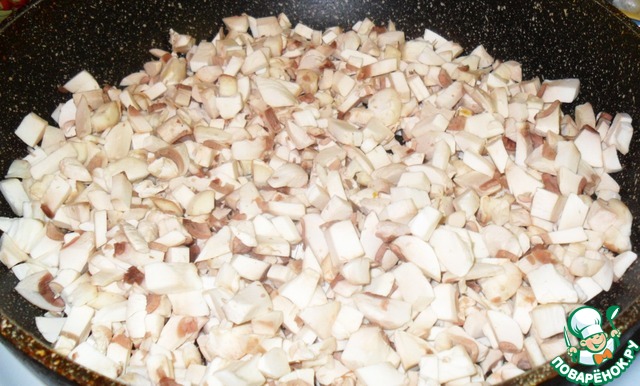 Начинка: Я использовала шампиньоны. Помыть, почистить и нарезать их на маленькие кубики около 1-1,5 см. При жарке грибы выделяют много влаги, поэтому, для того, чтобы они были поджаренные, а не варено-тушеные выкладываем их на разогретую и сухую сковороду и ждем, пока испариться влага (иногда помешивая).
