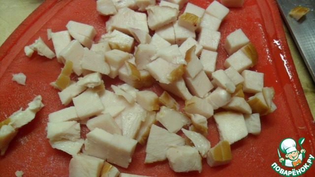 Ветчину нарезать кубиками около 1 см. И добавить к грибам и луку.
