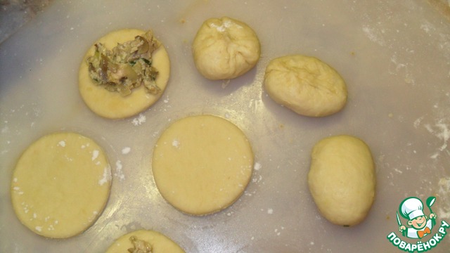 После этого раскатать его толщиной около 0,5 см и чашкой вырезать круги диаметром 8 см. На круги выложить по 1 ч. л. начинки. Дальше, держа в руках кружочек собрать все тесто к центру, закрепить, как показано на фото. Придать овальную форму и обкатать в руках, чтобы все швы пригладились.