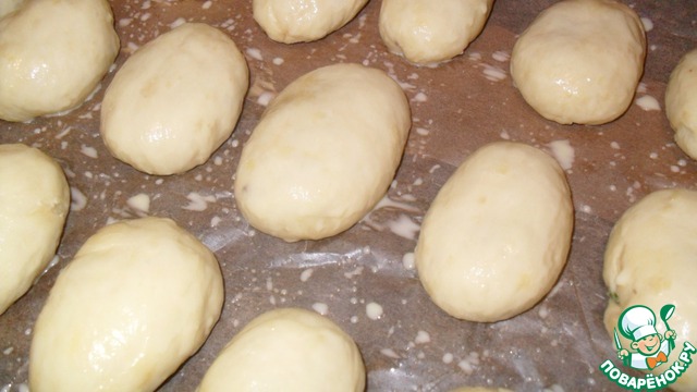 Выложить пирожки швом вниз на противень, застеленный пергаментной бумагой. Второй желток развести с небольшим количеством молока и смазать пирожки с помощью кисточки. Дать им подойти 15 минут. Поставить в разогретую до 200 градусов духовку и выпекать 25 минут. Главное не передержать, иначе тесто станет твердым.