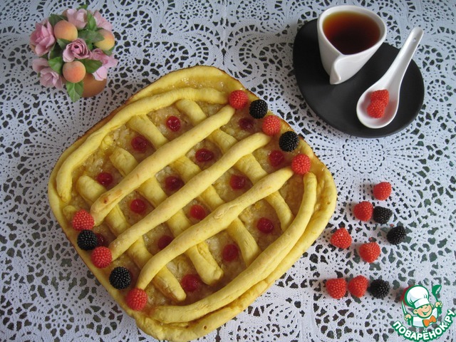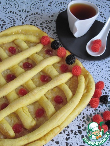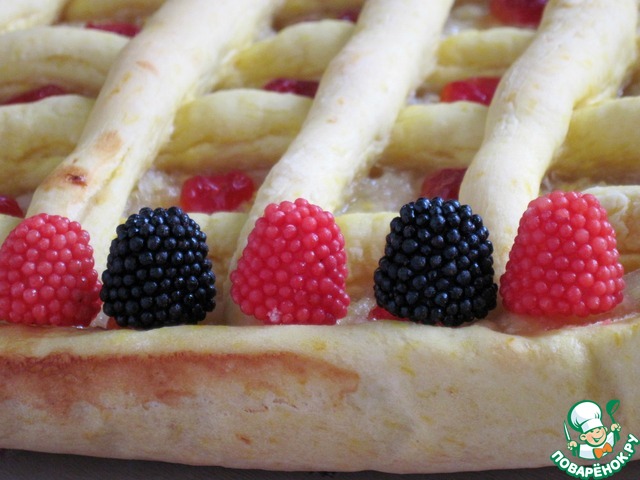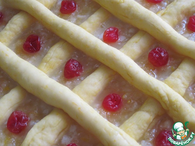 В ячейки для красоты уложим вяленую вишню. Пирог поставим в духовку на 45 минут. Выпекаем при температуре 180 градусов.