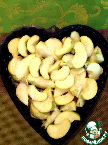 Яблочки помыть, разрезать на 4-6 частей, вырезать семена, кожуру можно не чистить. Форму для выпечки смазать сливочным маслом (или распределить по дну масляную стружку). Выложить яблоки и равномерно посыпать сахаром (я положила даже меньше половины стакана, и яблочки получились с кислинкой, для любителей сладкого можно увеличить количество сахара).