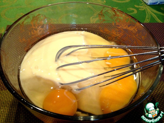 В это время займемся тестом: смешаем яйца, сгущенное молоко, муку и соду, гашеную уксусом (или лимонным соком). Взбивать миксером не нужно, достаточно просто перемешать венчиком.