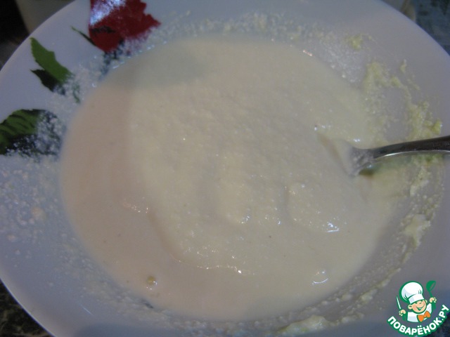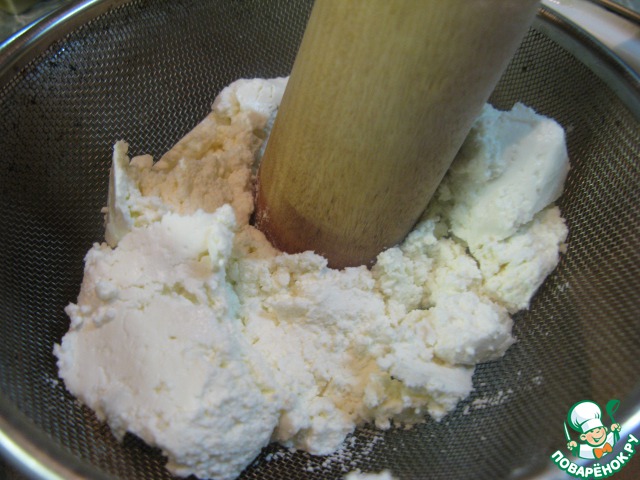 Второй слой начинки. Творог протереть через сито.