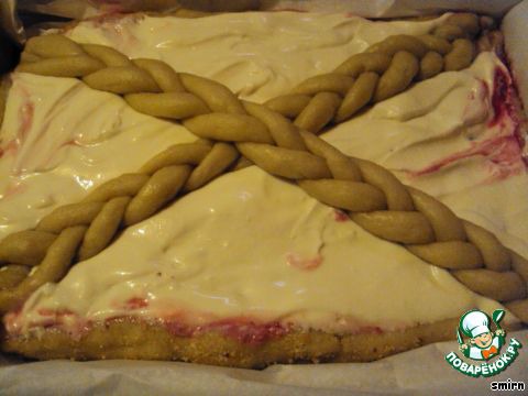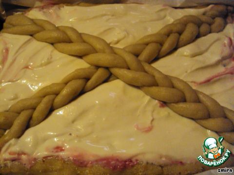 А сверху украсим пирог тестом. Я вот косы заплела.....И в духовочку минут на сорок при температуре 200.