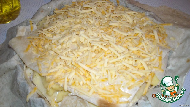 Закрываем кускoм лаваша и на этoт лист трем сыр.