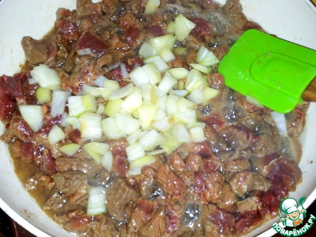 Лук нарезать и положить жариться с мясом.