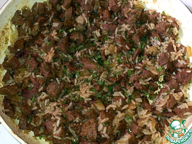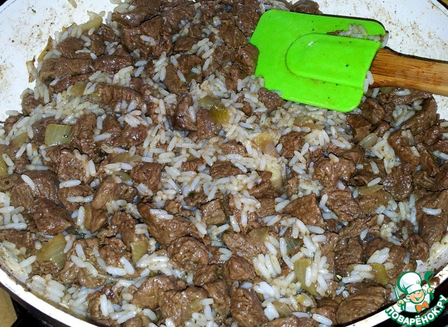 Вареный рис высыпать в сковороду с мясом и луком.
