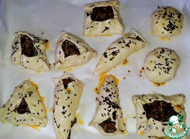 Пирожки выложить на противень застеленный пергаментной бумагой и смазать взбитым яйцом с добавлением тмина. Поставить в разогретую духовку до 180 градусов и выпекать 30 минут.